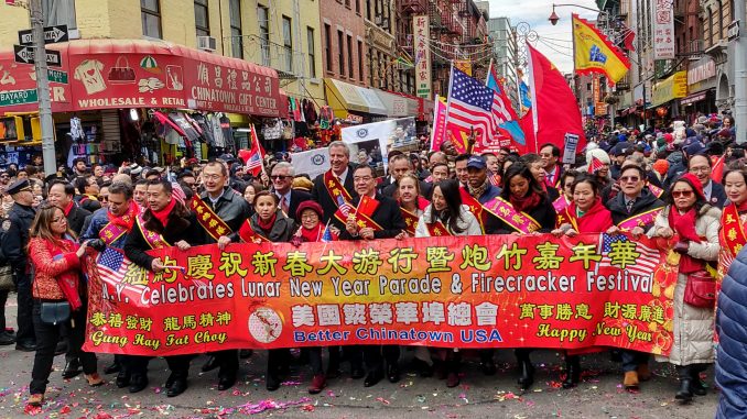 【Louis纽约影视工作室、中国侨声网记者林魁、Alice、森淼、御风者、黄江涛纽约报道】由美国繁荣华埠总会主办的第20届“纽约新春爱心花车大游行炮竹文化节”2月17日在曼哈顿华埠举行,吸引了数十万民众前来观看,在众多的民选政府官员及中领馆总领事和社区侨领带下,游行队伍从勿街出发,行经东百老汇、爱烈治街、科西街,最后在布隆街结束,游行队伍有纽约市警察局的乐队、骑警、古董车队、豪华车队、舞龙舞狮、「财神爷」、腰鼓队、传统中国舞蹈、及各种表和侨团花车等共12辆花车上万人的游行队伍,沿途向民众拜年,观众们则以花炮及欢呼声回应,盛况空前。