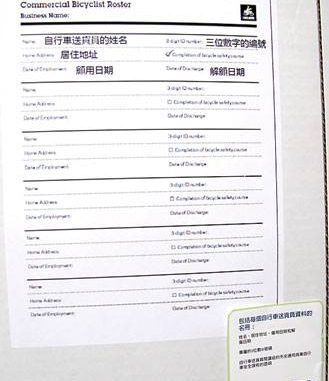 星島記者陳帆紐約報道:紐約市「商業自行車(CommercialBicycles)法」除了要求僱主必須為外賣郎提供必須的反光上衣、安全帽、企業ID卡以及自行車配備外,僱主還需要在出勤名冊上填寫外賣郎的資訊。經營中餐館的鄭先生於日前便因未持有外賣郎出勤名冊而初次被罰,而再被查時也未能提供而被加重處罰。