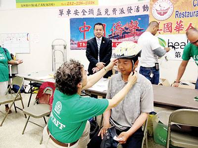 【侨报记者叶永康6月12日纽约报道】12日,在美国华人餐饮业协会的要求下,交通局在华埠孔子大厦交谊厅免费派发200个头盔。众多外卖郎前往领取。协会主席陈键榕表示,8月份还将有一个更大型的免费头盔活动。送头盔活动于下午2时至4时进行,闻讯而至的外卖郎络绎不绝,其中有多名女性。他们首先在门外排队,拿了号码后入内登记,然后向交通局人员出示一张外卖郎的证件。工作人员为他们量度头部呎吋,共有大、中、小三种呎码,然后申领者可以选择颜色,戴上头后觉得合适的话,便告功德圆满。多名受访的外卖郎表示,开工前他们都会仔细检查装备是否充足,所以至今还未吃过罚单。一名陈姓外卖郎说,他原本有一个头盔,但已有破损,老板叫他多申请一个。有几个外卖郎因为忘记带证件而白跑一趟。在场帮忙的陈键榕说,商业自行车使用安全法规实施一个月以内,每天都有华人外卖郎违规而遭罚的事情发生,他呼吁业者严守法规,避免受罚。陈键榕说,除了今次送头盔外,8月也会在华埠再办一次更大型活动,送出500个头盔。该会希望藉着这两个推广会,提醒外卖郎遵守安全法规。